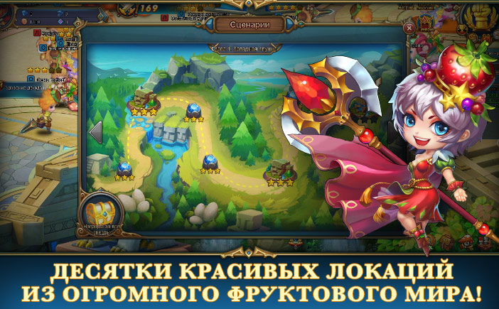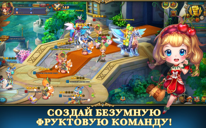 Эта красочная многопользовательская игрушка онлайн обладает удобной системой, в которой сплетены составляющие как стратегические, так и ролевые механики геймплея. Вам предстоит спасти этот уникальным материк, который подвергся нападкам злобного лорда. Но этот ужасный персонаж еще не подозревает, что именно вы намерены разрушить его коварные планы. Приготовьтесь, ведь спасать Гейм вы будете не в одиночку, а в компании обезбашенных фруктов, которые способны на безумства ради своей родины. У каждого из них есть свои особенности и преимущества, а также уровни урона, при этом вы сможете прокачивать необходимые составляющие. Посещайте ПвП арену для боев, именно здесь вы сможете доказать свое превосходство над реальными противниками. Вам точно не придется скучать, ведь в игре предусмотрено множество заданий, вы сможете участвовать в квестах и исследовать подземелья, а также многое другое.