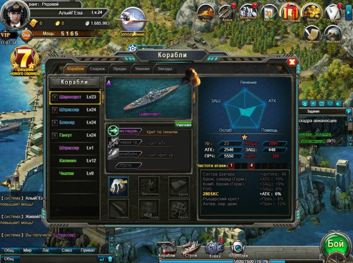 Warships - браузерная стратегия, все битвы в которой происходят на воде. Игра начинается со знакомства с командным центром, где герои и будут выполнять все основные действия. Здесь можно улучшать и покупать новую технику, создавать уникальные игровые вещи, изучать технологии и так далее. Неоспоримым преимуществом Warships является большой выбор техники: линкоры, крейсеры, авианосцы и даже обычные катера. Каждая единица техники имеет свои уникальные характеристики и возможности. Кроме того, всю технику можно улучшать, устанавливая на нее дополнительные модули и изучая новые технологии.