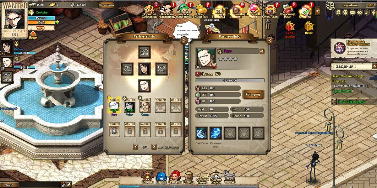 Выбор пути развития героя в One Piece Online зависит от самих игроков. Можно стать на сторону Мирового Правительства – старых тиранов, мечтающих о полном контроле над планетой, или присоединиться к Худшему Поколению – сообществу, которое хочет свергнуть мировой порядок. И в том, и в другом случае вам не обойтись без помощников – так называемых «звездных партнеров», коих в распоряжении героя может быть целых 5 штук. Эти ребята доступны в Таверне, прокачиваются вместе с главным героем и очень полезны в битвах.