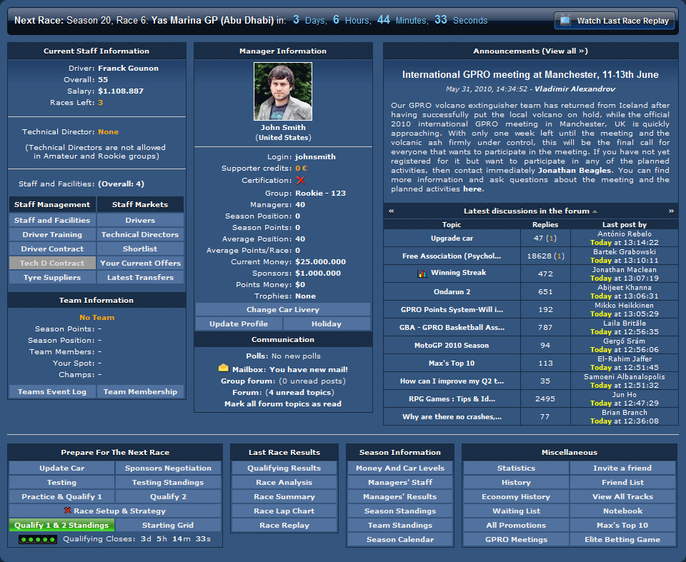 Grand Prix Racing Online представляет собой онлайн-менеджер автомобильных гонок, в которой вам предстоит взять на себя управление гоночной командой. Ключ к успеху заключается в эффективном управлении командой, выборе оптимальной стратегии, грамотном распределении бюджета на модификацию гоночного болида и подготовке его к предстоящей квалификации, успешном ведении переговоров со спонсорами, а также обучении пилотов и продвижении их по карьерной лестнице.
