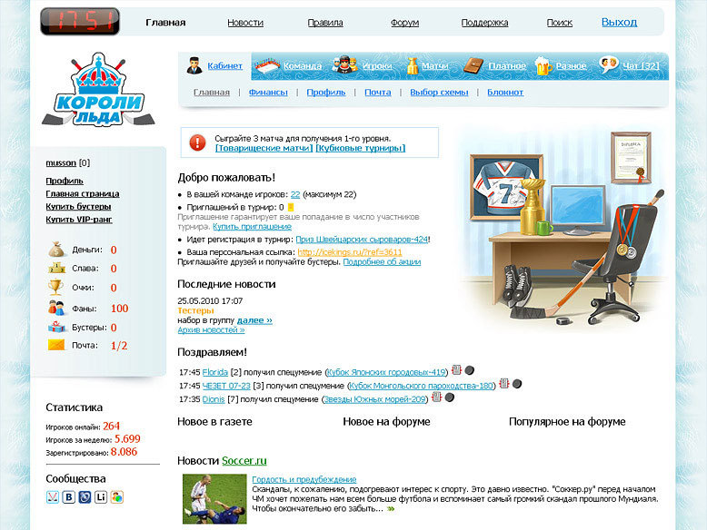 Короли льда, как, впрочем, и другие проекты, предлагает лишь один вид развлечения – турниры. Проходят они по расписанию, причем заявки на участие принимаются за 15 минут до старта. Победы в соревнованиях приносят в казну деньги, которые необходимы для успешного функционирования клуба, а также повышают параметр почета. Его уровень влияет не только на рейтинг команды, но и на отношение к ней «звездных» игроков – чем выше ваш рейтинг, тем проще вам будет нанять хороших спецов.