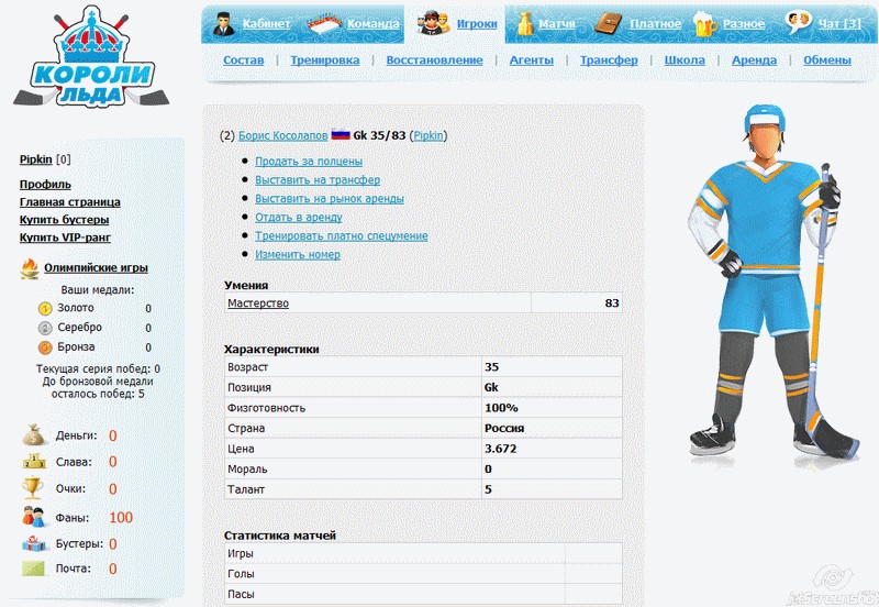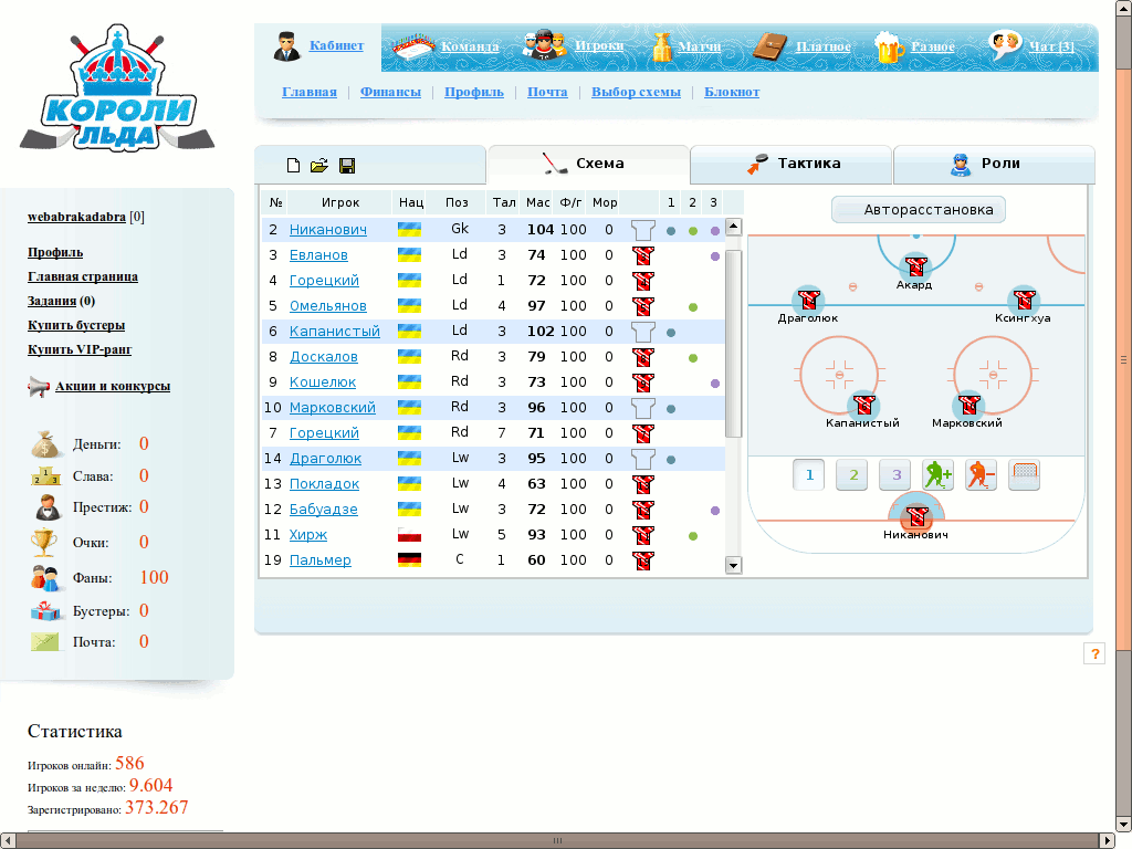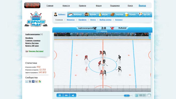 Если вы знакомы с игрой 11х11, то суть нового браузерного проекта Короли льда вам будет понятна сразу. Основой основ игрового процесса здесь служат характеристики и умения каждого хоккеиста. Мастерство спортсмена включает в себя целый ряд навыков: перехват, передачу, отбор шайбы, силу броска и еще десяток параметров. Не менее важным является и положение игрока на поле. Поставив вингера на позицию полузащитника, вы ощутимо понизите эффективность команды. Чтобы иметь некоторый простор для действий, придется тренировать навык совмещения позиций, однако подобное умение доступно только опытным хоккеистам.